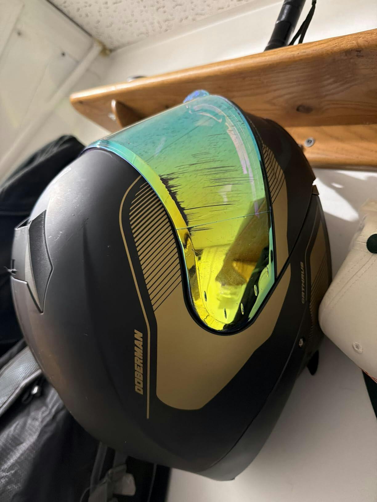 This OTS Doberman Matte Black Gold flip-up Helmet is an excellent choice for biking. Featuring a convenient flip-up design, a sleek LED spoiler, and a chrome visor for enhanced visibility, it's lightweight but DOT approved for safety. An ideal complement to your bike.